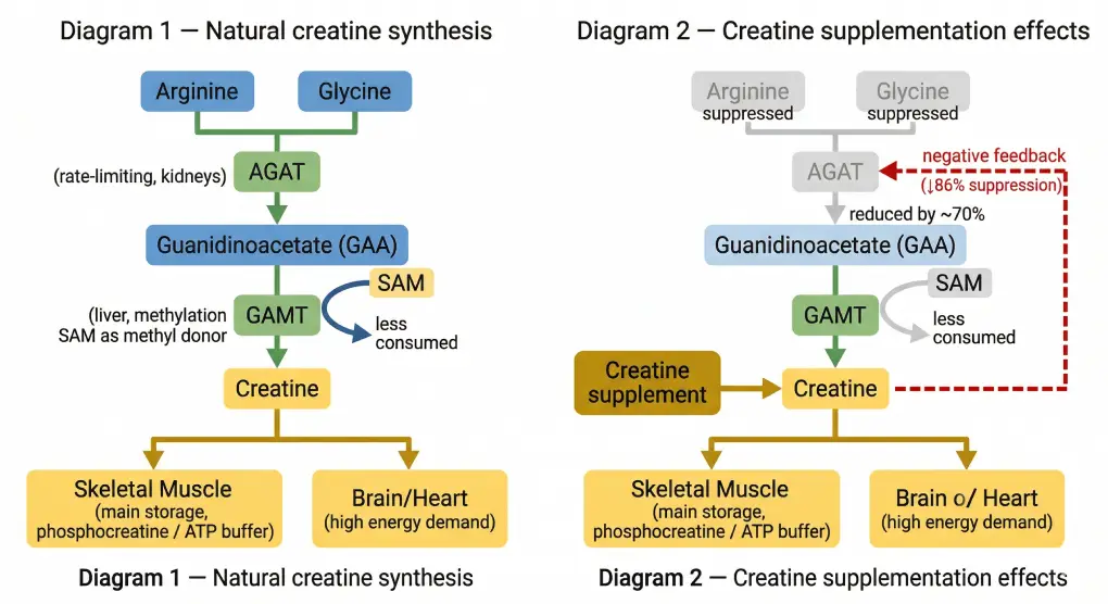 When you supplement with exogenous creatine, your body detects elevated levels and responds logically: it suppresses AGAT activity. Why produce something you’re already getting from outside? It downregulates its own production. You’ve effectively told your body’s internal creatine factory to stand down.